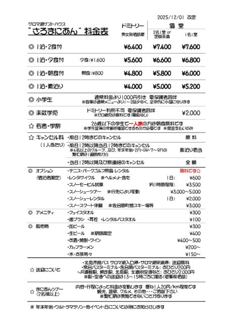 ・6月下旬のサロマ湖100kmウルトラマラソン時の宿泊料金については、別に定めさせていただいております。詳しくはウルトラマラソンの案内ページをご覧ください。
